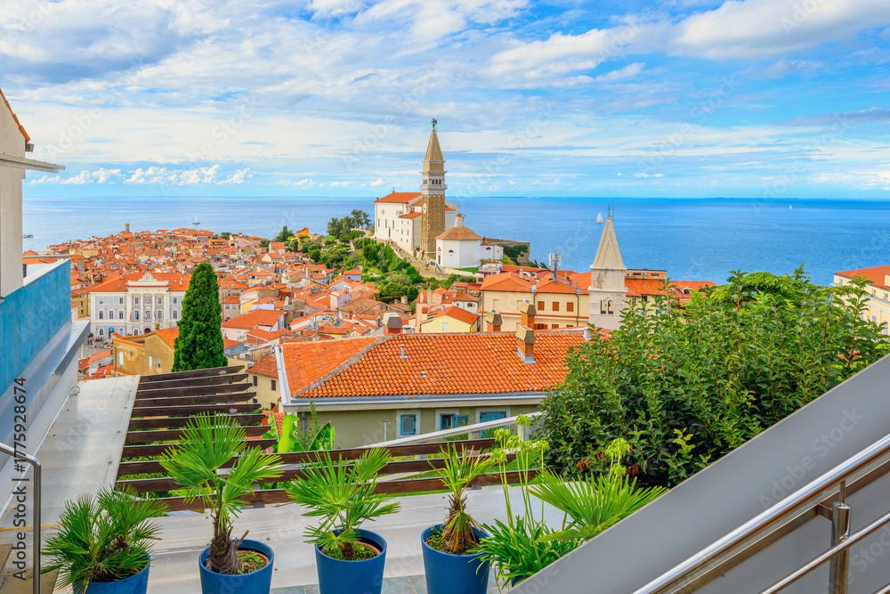 Hilltop view of the seaside medieval old town of Piran, Slovenia, with St George church tower rising above and the Adriatic Sea in view on the Istrian Peninsula.