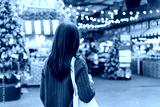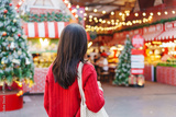 Young Asian woman wearing red cardigan walking and shopping at the Christmas market