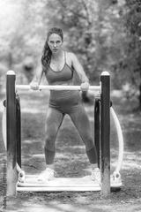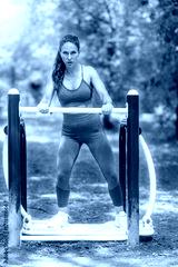 Woman wearing purple sports outfit while training on outdoor gym bars, showing strength, balance, and correct form. Promotes healthy, disciplined lifestyle.