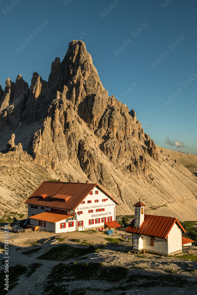 Golden Sunrise Over Rifugio Locatelli and Tre Cime in Italy