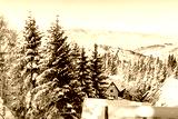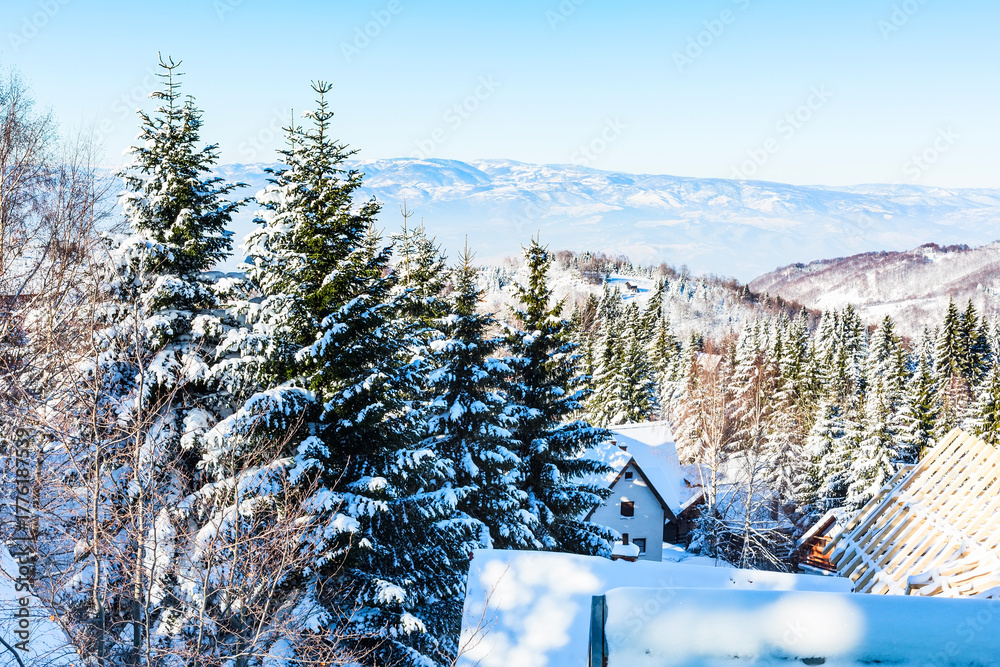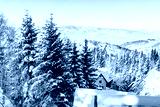 aerial winter mountain panorama, snow trees, blue sky
