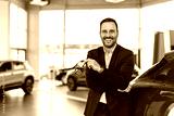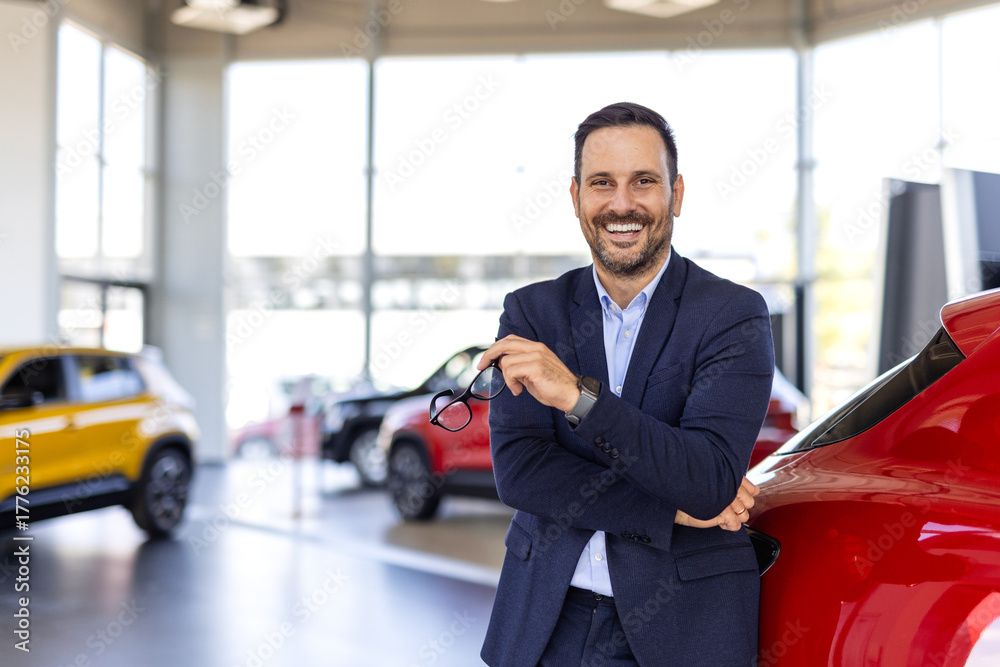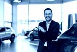 Successful deal in a car showroom. Handsome male car salesman working in the showroom. Salesperson at car dealership selling vehicles.
