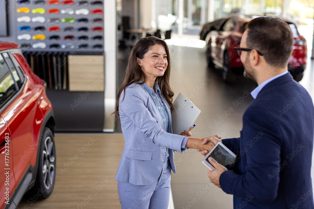 Smiling salesman or manager giving car keys and shakes hand to modern happy woman new car owner in car dealership