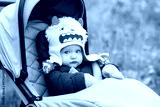 A baby boy wearing a white monster hat, jacket, and mittens sits in a green stroller in a park. The child is 10 months old.