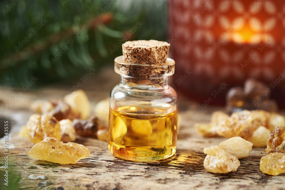 A bottle of aromatherapy essential oil with frankincense resin and Christmas decoration on a table