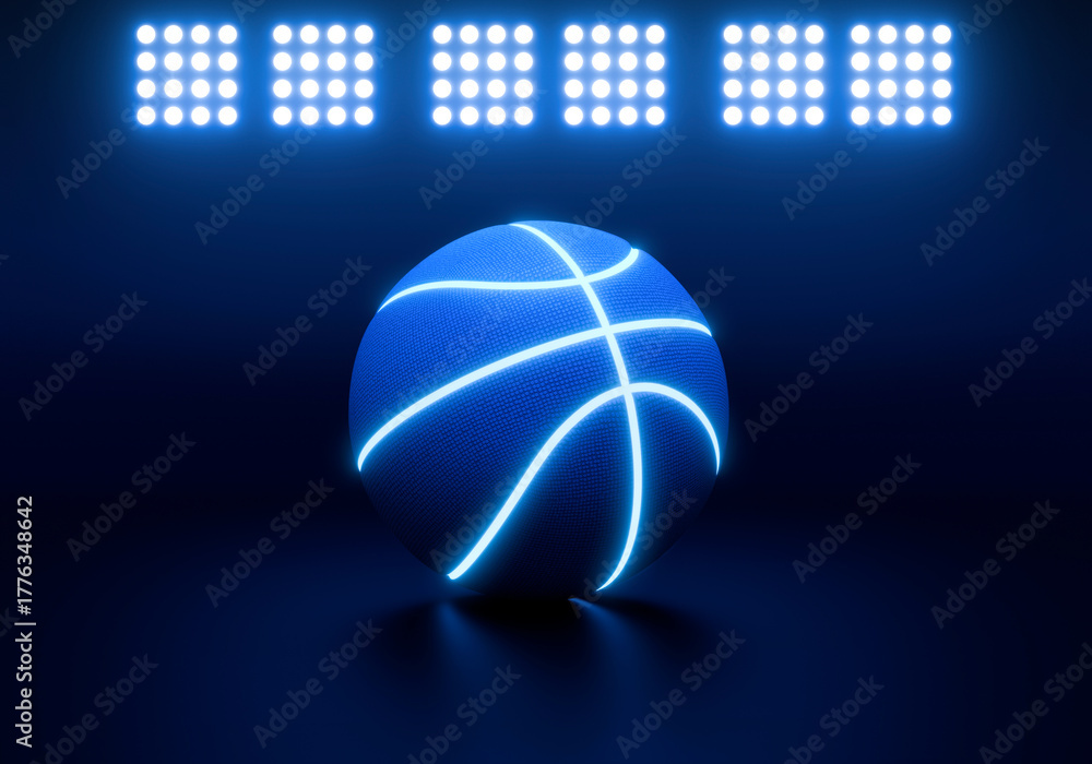 Blue basketball with bright blue glowing neon lines in under illuminated floodlights