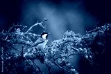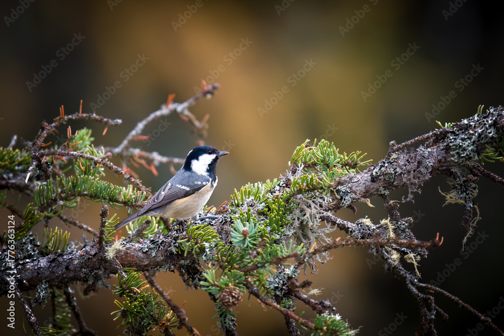 a coal tit, periparus ater, perched on a spruce at a autumn day