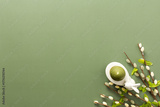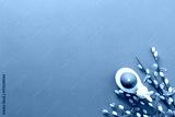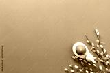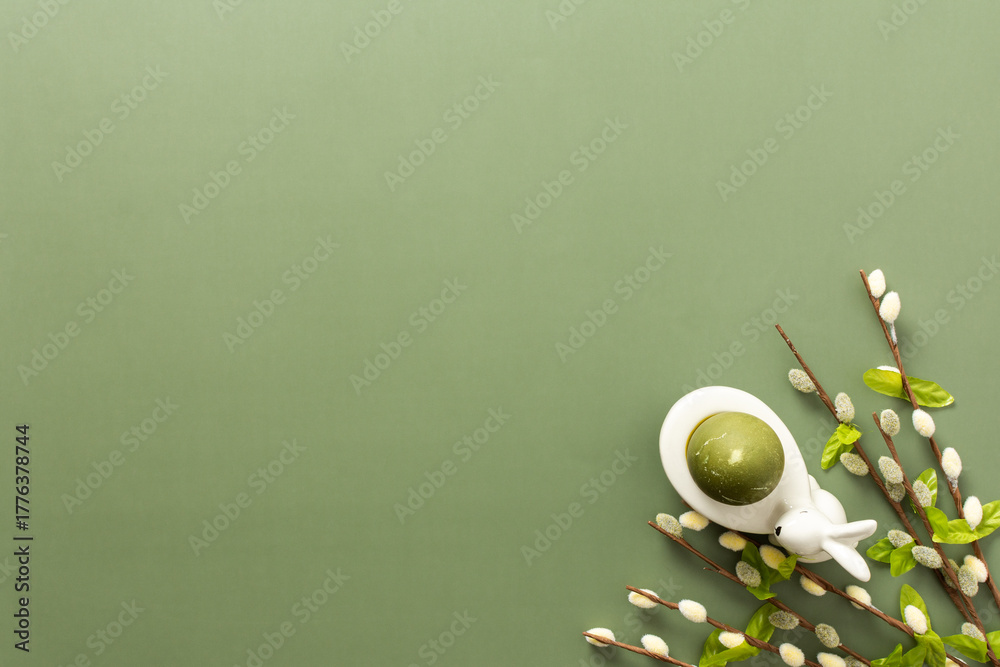 Festive Easter decorations include a cute bunny figurine, colorful egg, and delicate spring branches, creating a cheerful atmosphere perfect for the holiday