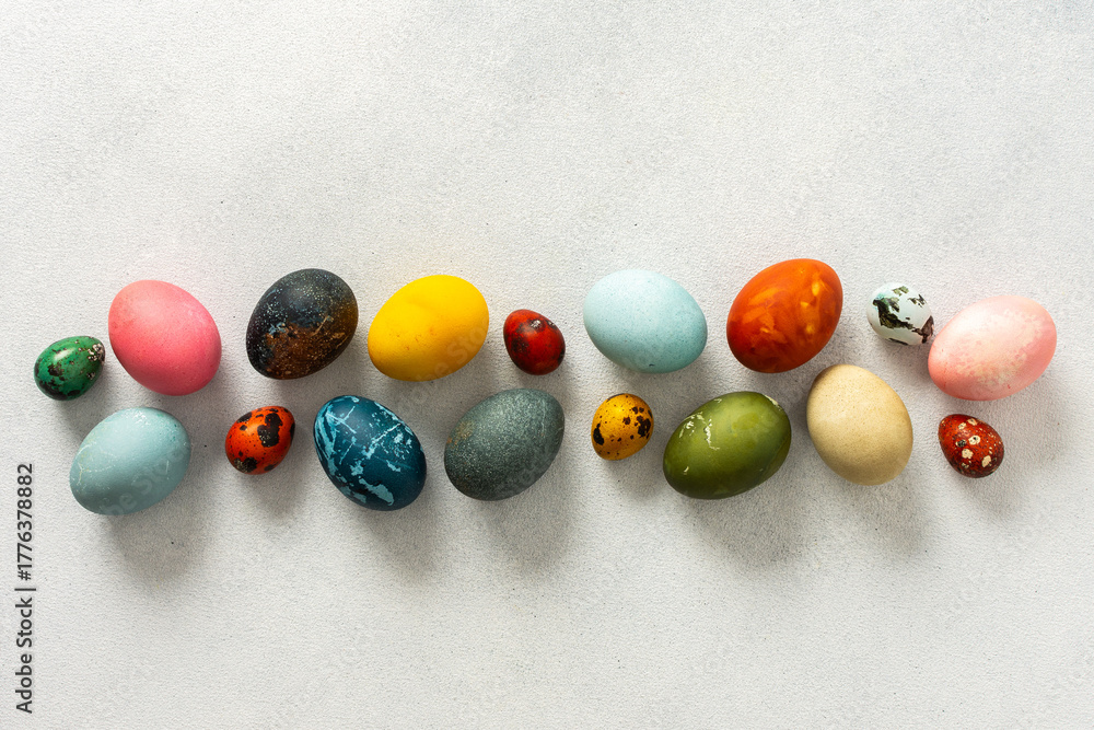 Various Easter eggs in vibrant colors and patterns are neatly arranged, showcasing the joy and creativity associated with spring celebrations and family gatherings