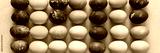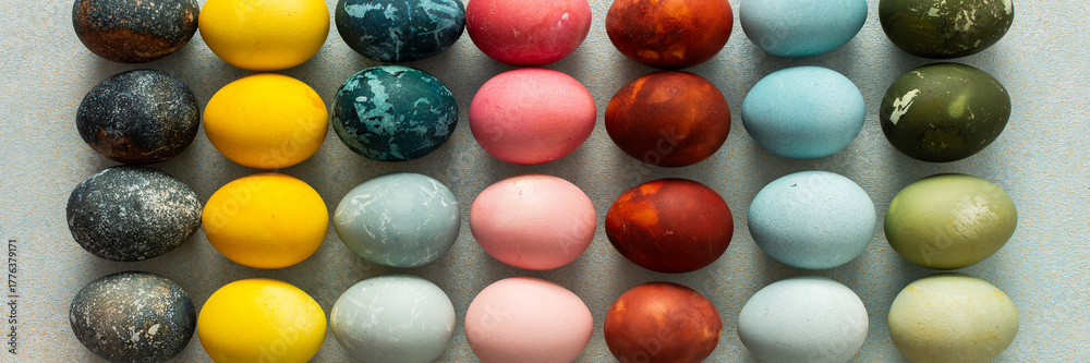 A beautiful array of hand-dyed Easter eggs in various colors, neatly arranged in rows. This colorful display celebrates the spring season and Easter traditions with creativity, banner