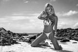 Sexy woman in golden bikini posing on tropical beach with volcanic rocks and turquoise ocean, luxury fashion and summer lifestyle concept on Mauritius island