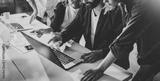 Working process at office.Group of young coworkers work together modern coworking studio.Young people making conversation with partners.Horizontal Wide.Blurred background.