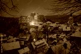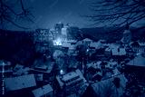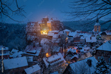 Hohnstein Castle above a snow-covered village during blue hour, Saxon Switzerland, Germany