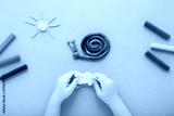 Little child hands making and creating snail and sun from colorful modeling clay on light blue table background. Pastel color. Closeup. Point of view shot. Top down view.