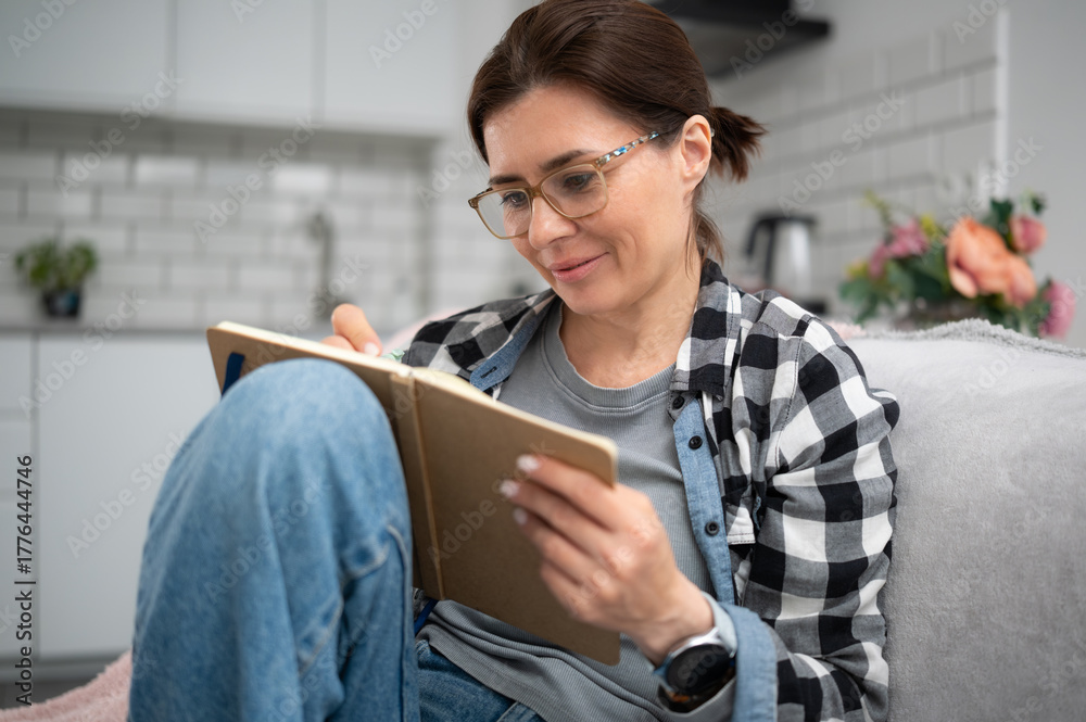 Happy Girl Sitting On The Sofa At Home Writing In A Notebook