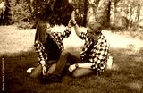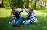 Father And Daughter Sitting On Grass In A Summer Park Giving A High Five