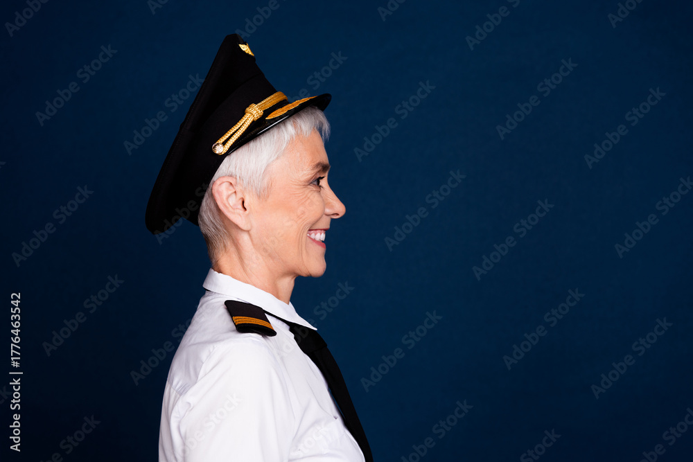 Photo portrait of attractive senior woman passenger plane captain profile dressed aviator uniform isolated on dark blue color background