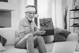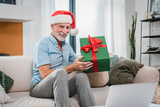 A cheerful elderly man grandfather wearing Santa hat holding showing presents a wrapped gift box in home interior, have video call with family grandchildren. Merry Christmas concept