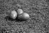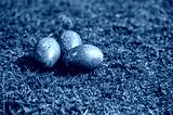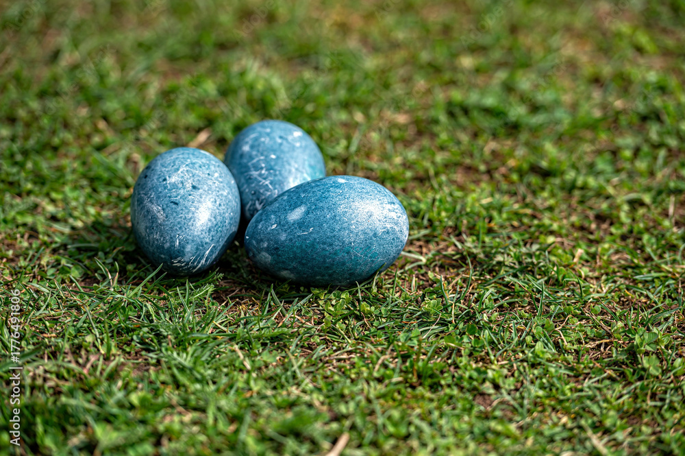 Colorful blue Easter eggs placed on green grass during springtime