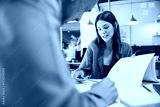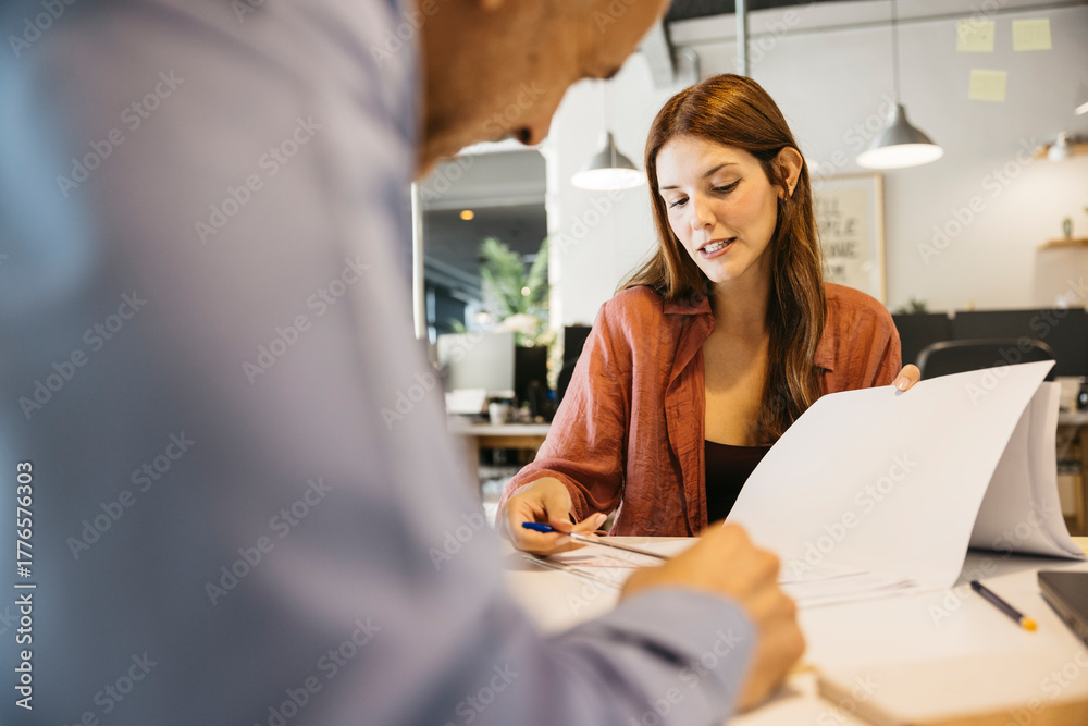 Coworkers discussing business planning and working in office