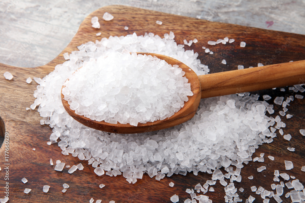 sea salt with wooden spoon and crystals of salt on wooden background.
