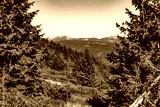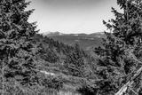Panoramic view of evergreen mountain forest with distant peaks under clear blue sky, natural wilderness landscape for hiking and travel.