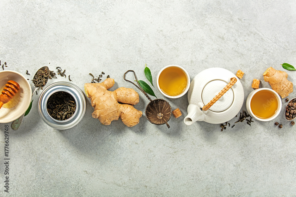 Tea Ingredients and Teapot with Cups on Stone Background