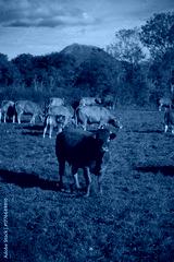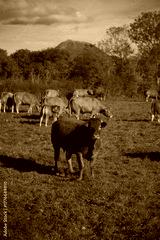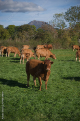Troupeau de vaches de races Salers et Aubrac dans leur pré, devant le volcan du Puy-de-Dome