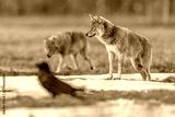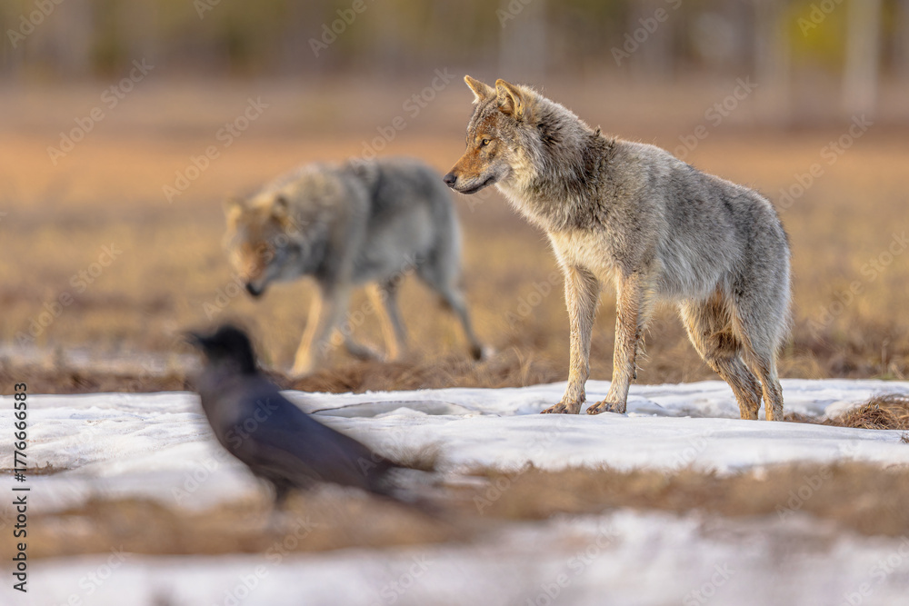 Two Eurasian Wolf looking with raven