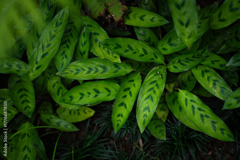 Abstract of green leaves in dark tone for background texture concept.