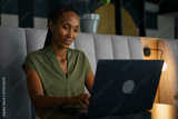 Confident young businesswoman in smart casual using laptop at desk in office lobby