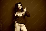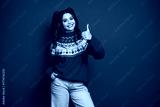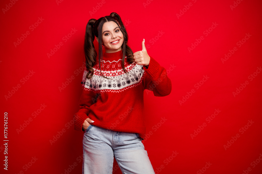 Happy woman in red knitted christmas sweater gives thumbs up against red background christmas season shopping holiday joy festive studio portrait