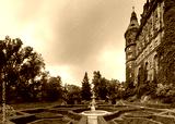view of the rear gardens and the castle tower of Ksiaz Castle in southwestern Poland