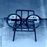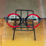 Round red and black eyeglasses on modern metal stand with clear lenses reflecting shop interior. Concept of vision, eyewear design, stylish optical accessory