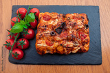 italian authentic food focaccia bread with tomatoes and basil in a black plate