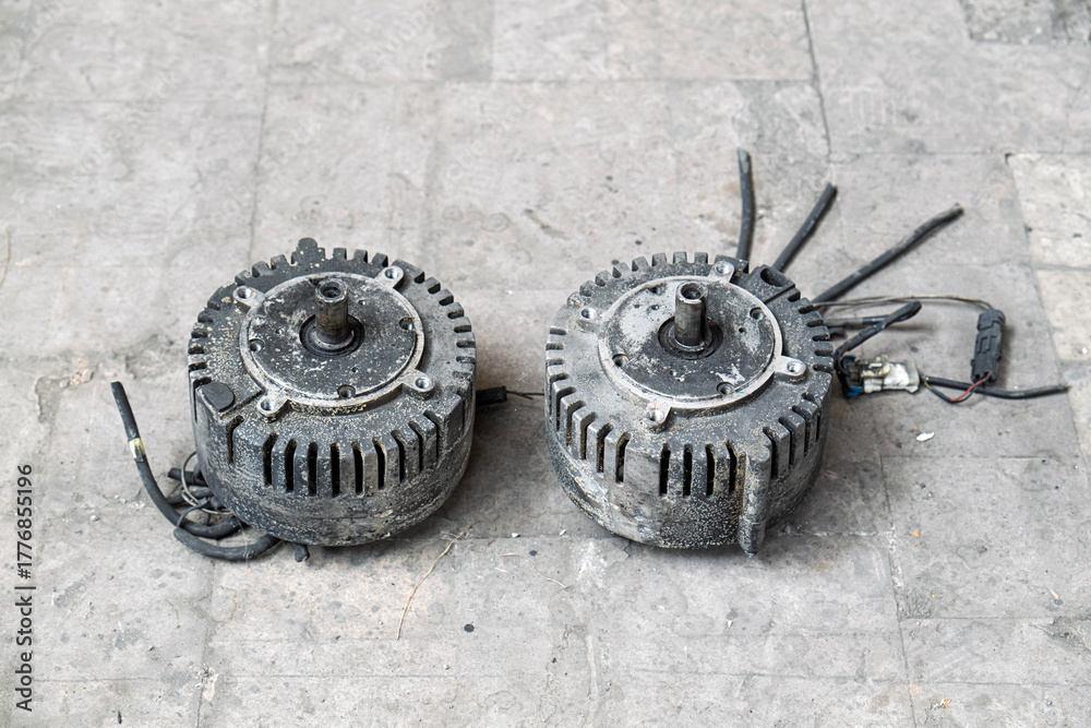 Two old, dirty, and rusted motors engine are laying on a concrete floor. The wheels are in a state of disrepair, with dirt and grime covering their surfaces. Scene is one of neglect and abandonment