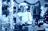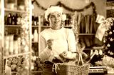 Interested young girl in casual sweater and Santa hat selecting goodies and wine in holiday-decorated grocery store, following shopping list to buy snacks for home New Year Eve party