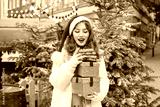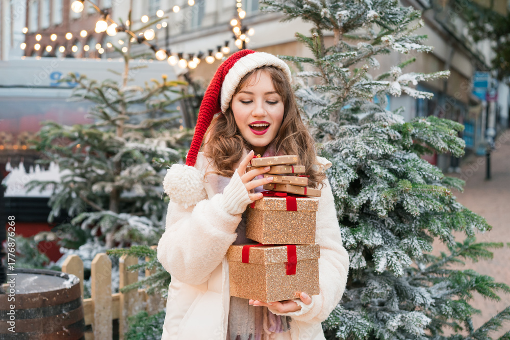 Excited Young woman in Santa hat with with a tower of gift boxes on traditional city street Christmas market. Happy woman choosing Christmas gifts. Merry Xmas Happy New Year festive shopping, sales.
