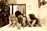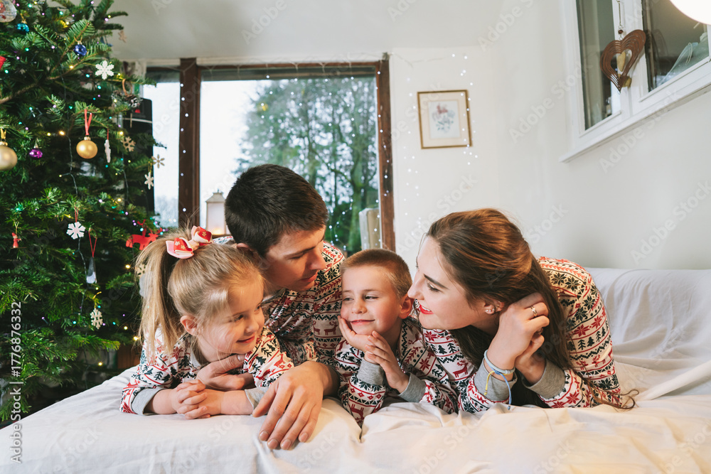 Happy family in festive pajamas hugging on bed on Christmas Eve in decorated apartment. Dad, mom,daughter, son are lying on bed and having fun together. Family celebrating winter holidays at home