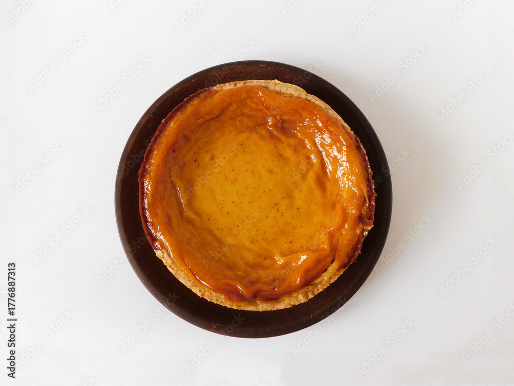 Freshly baked pumpkin pie with golden crust and smooth spiced filling on a brown plate. Classic autumn dessert on white background