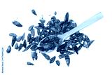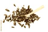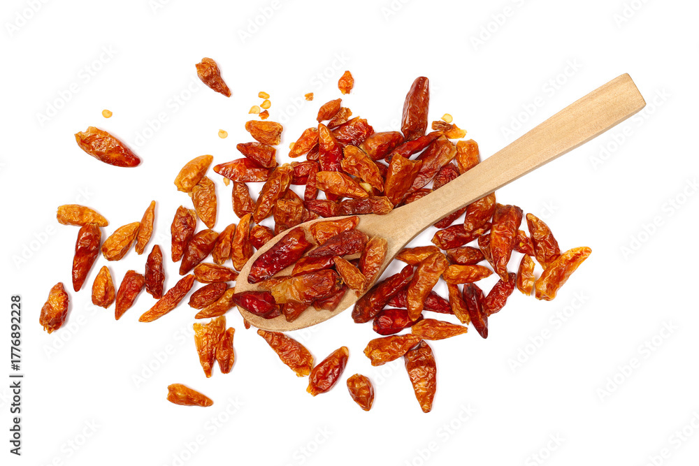 dried bird's eye chili peppers in wooden spoon isolated on white background, top view