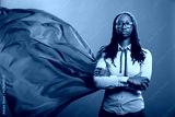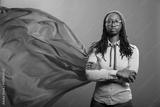 Confident african american woman stands with crossed arms and red cape flowing, striking a power stance in studio. She radiates strength, style and empowerment on blue background.