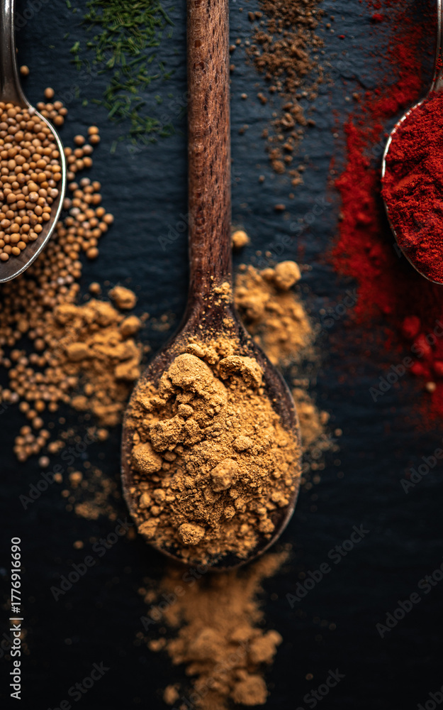 Assorted colorful spices on metal spoons, top view food background