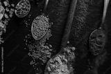 Assorted colorful spices on metal spoons, top view food background