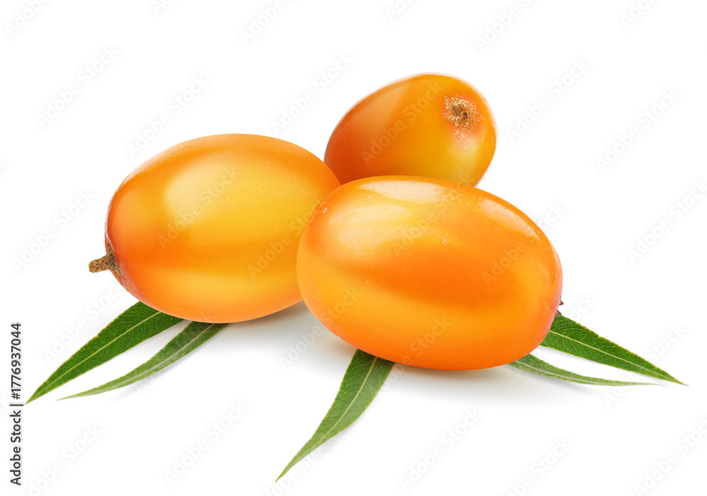 Sea buckthorn berries and green leaves isolated on white