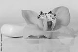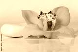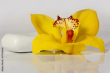 Yellow orchid with white soap and towel on the white background - wellness & spa