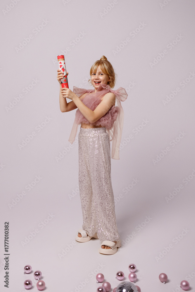 Young caucasian girl, blonde hair, pink festive top, sequin pants, white shoes, side view, holding confetti popper with falling confetti, studio shot. Concept Christmas, New Year, birthday, party.
