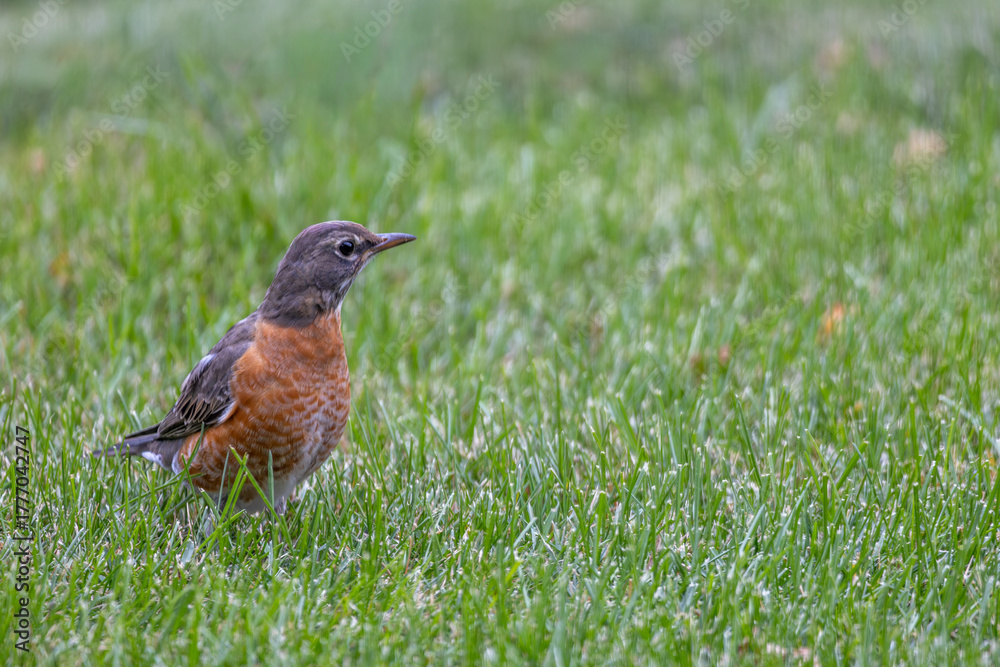 Outdoor view of an American robin (turdus migratorius) perched in a grassy lawn