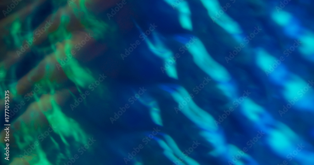 Defocused illumination overlay. Colorful flare. Blue green glossy wavy texture. Neon luminosity abstract kaleidoscopic background.