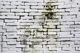 White brick wall texture background with green algae or Lichen.